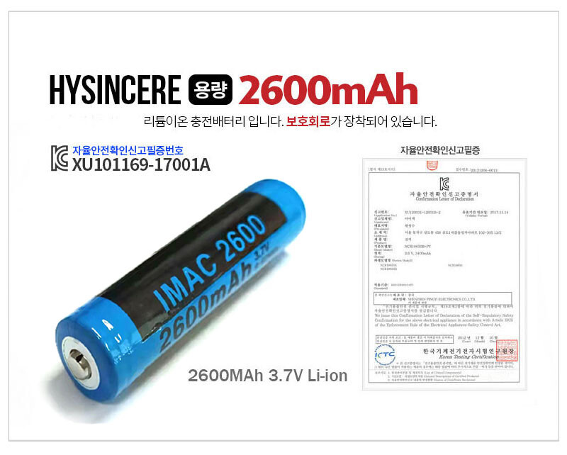 2600mAh 18650배터리 3.6v 보호회로 KC인증