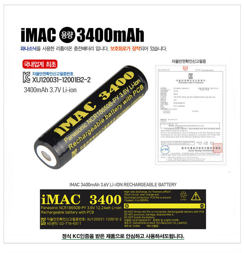 3400mAh 18650배터리 3.7v 보호회로 KC인증