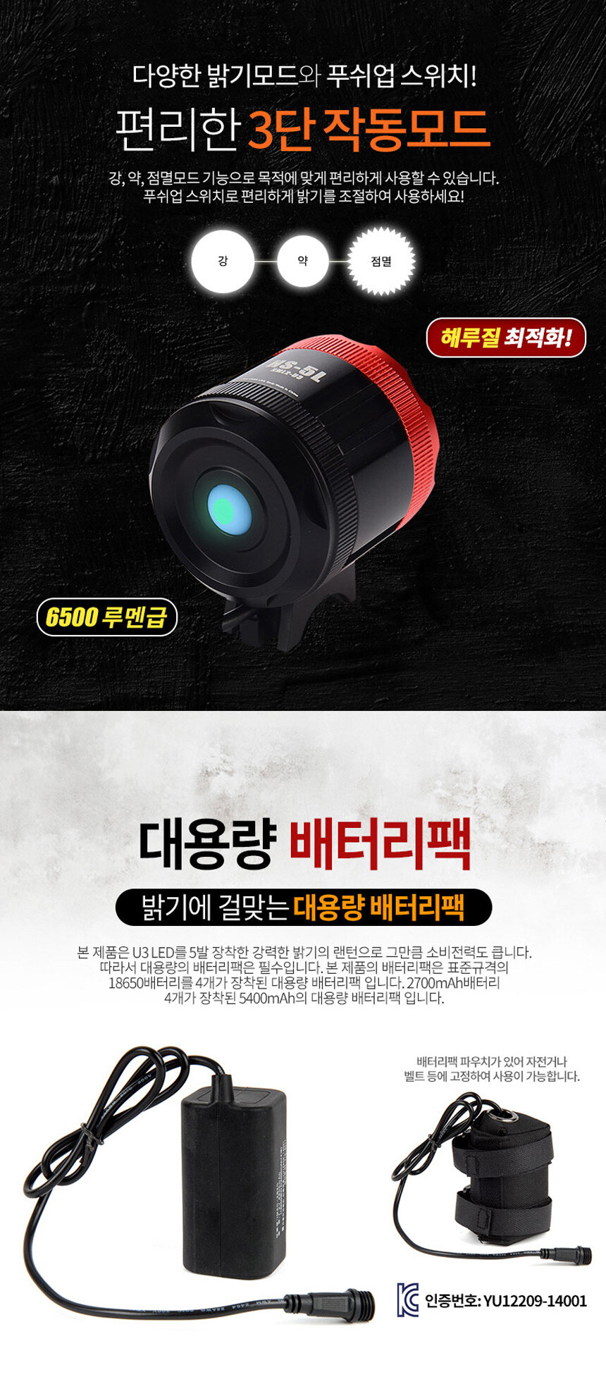 6500루멘급 밝기를 출력하는 고출력 헤드랜턴.