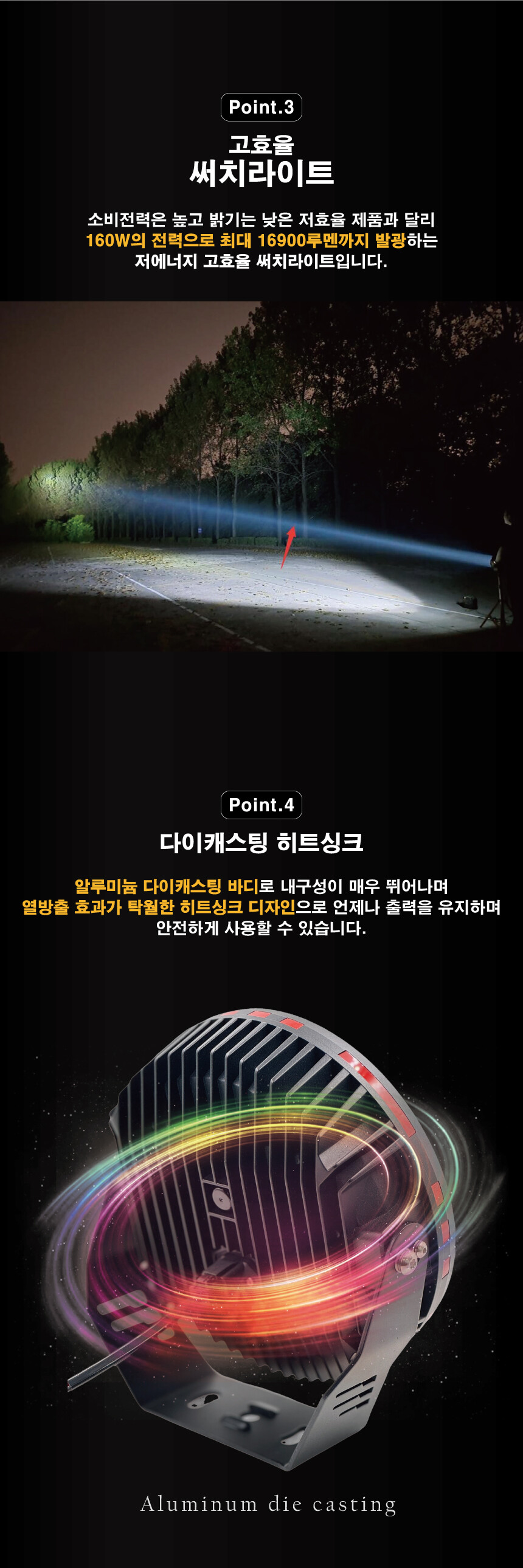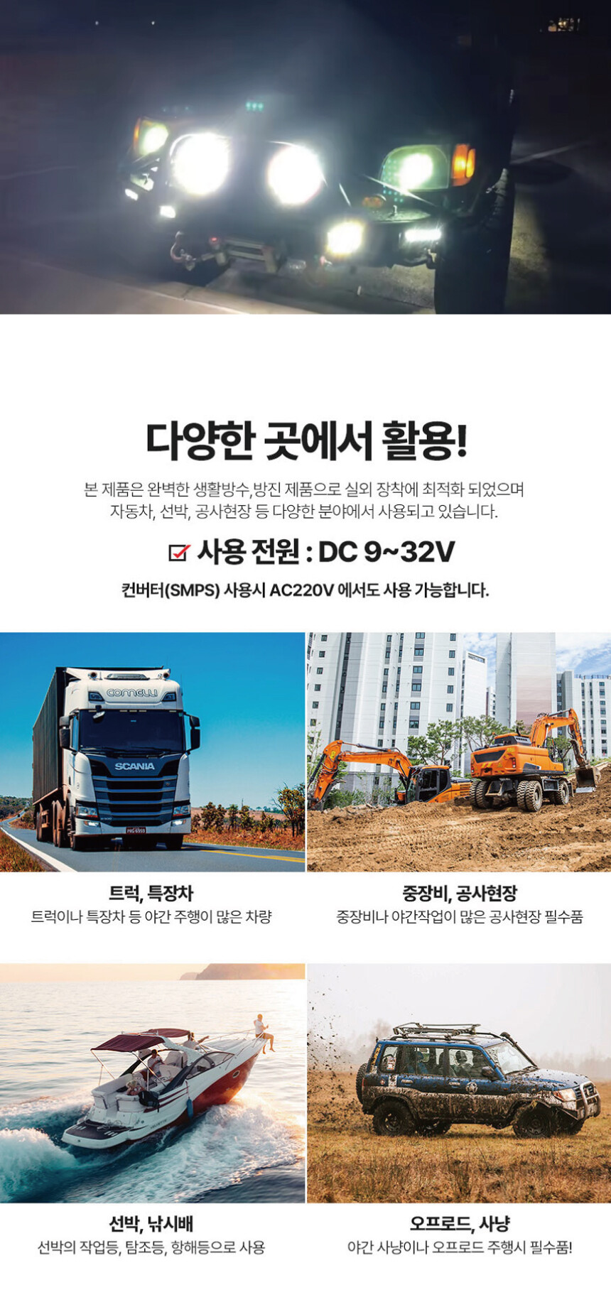 등 다양한 곳에서 밝은 빛을 비춰주는 DC 써치라이트입니다.