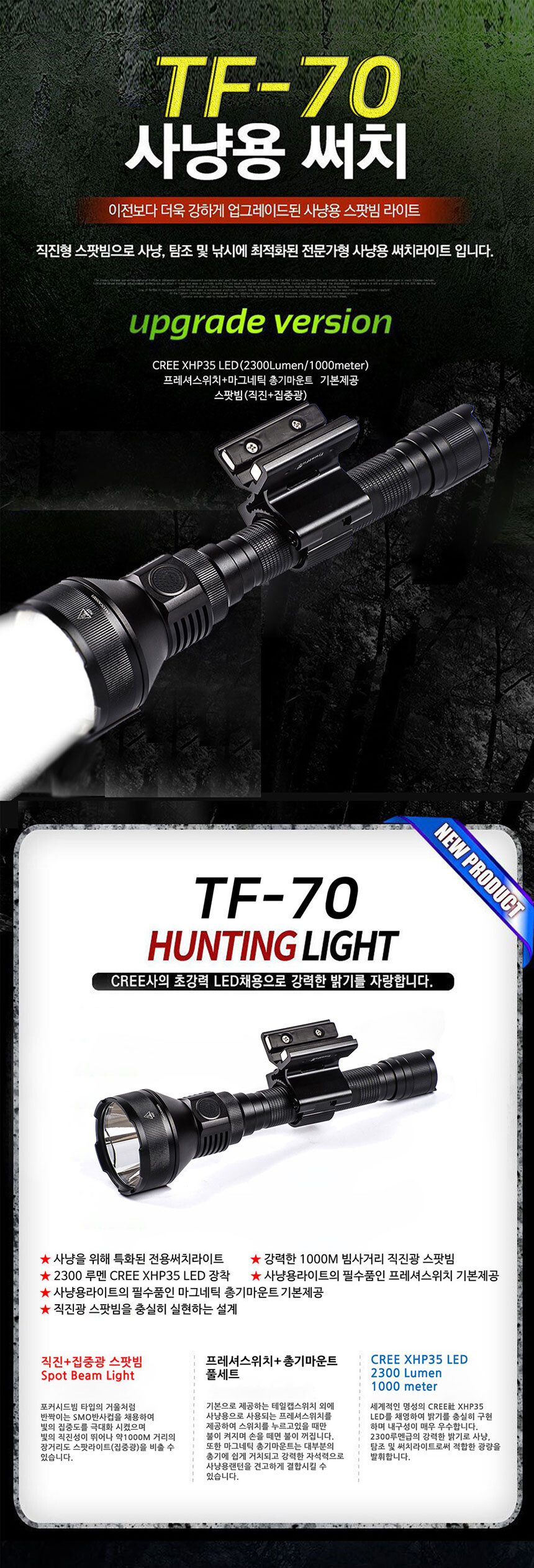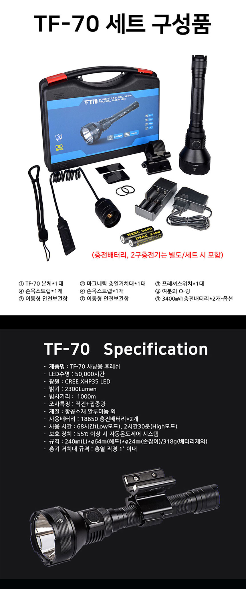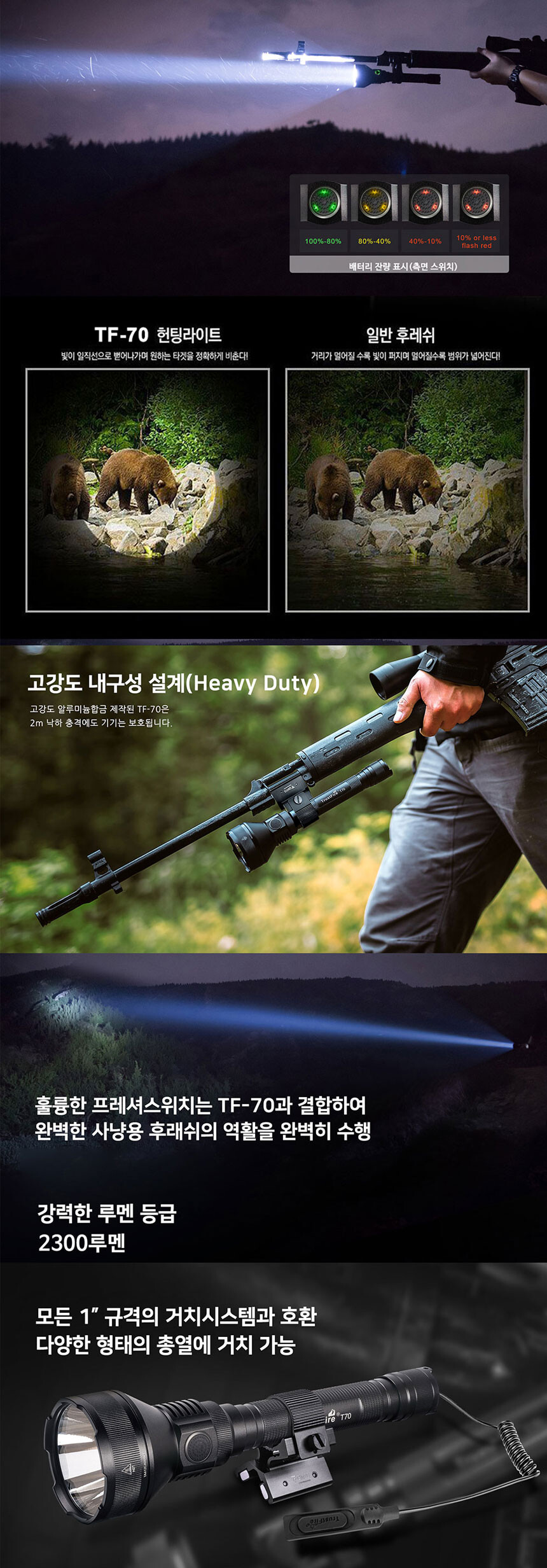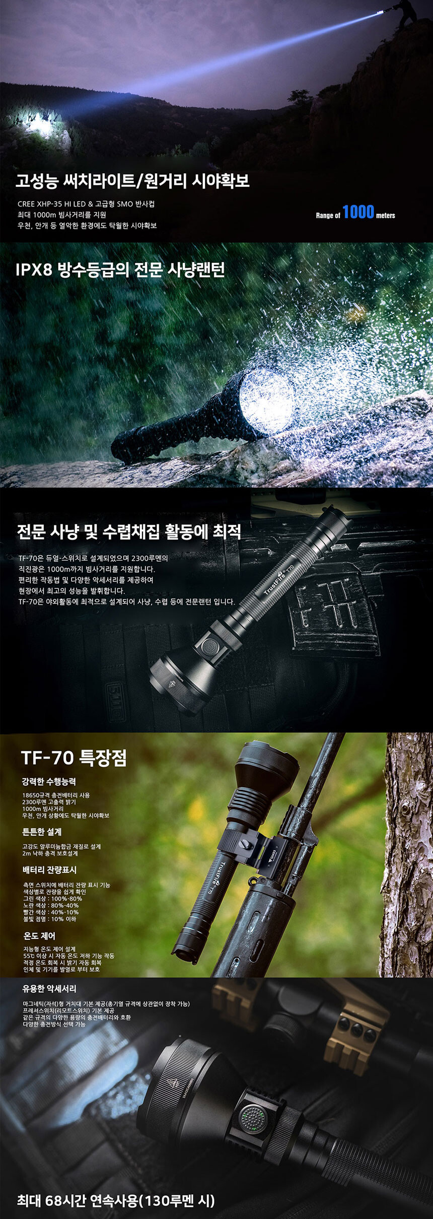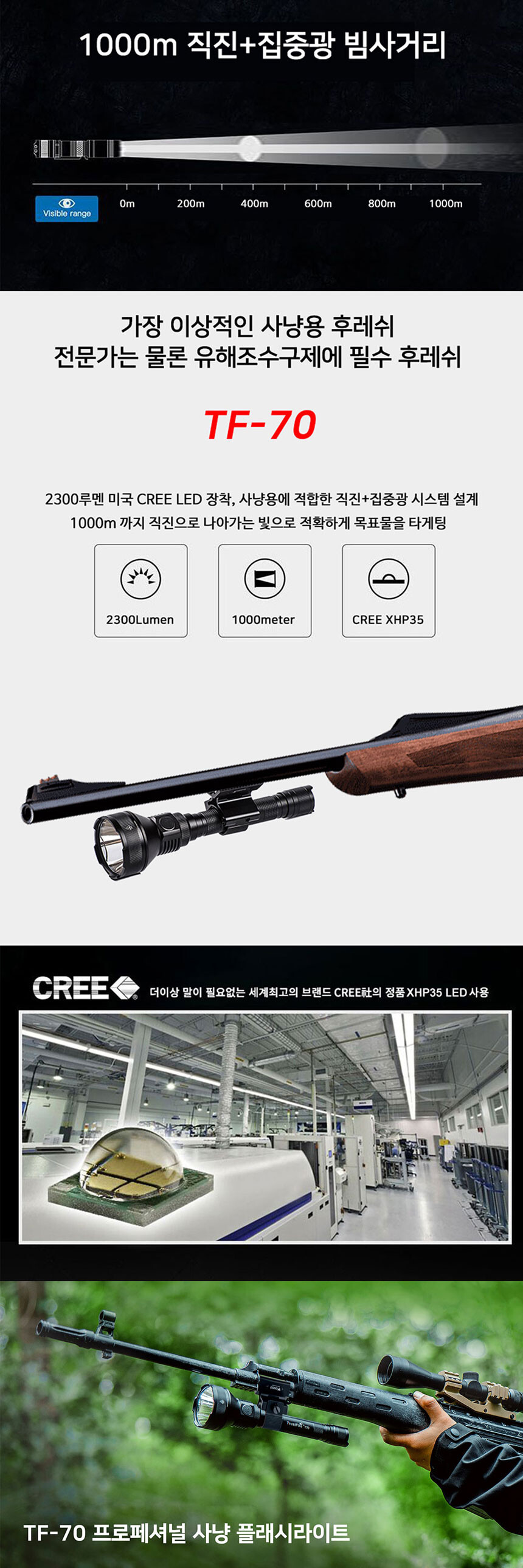 사냥 / 탐조 / 탐사 / 유해조수 구제 등 밝고 멀리 뻗는 빛이 필요한 모든 곳에 사용하기 적합한 손전등입니다.