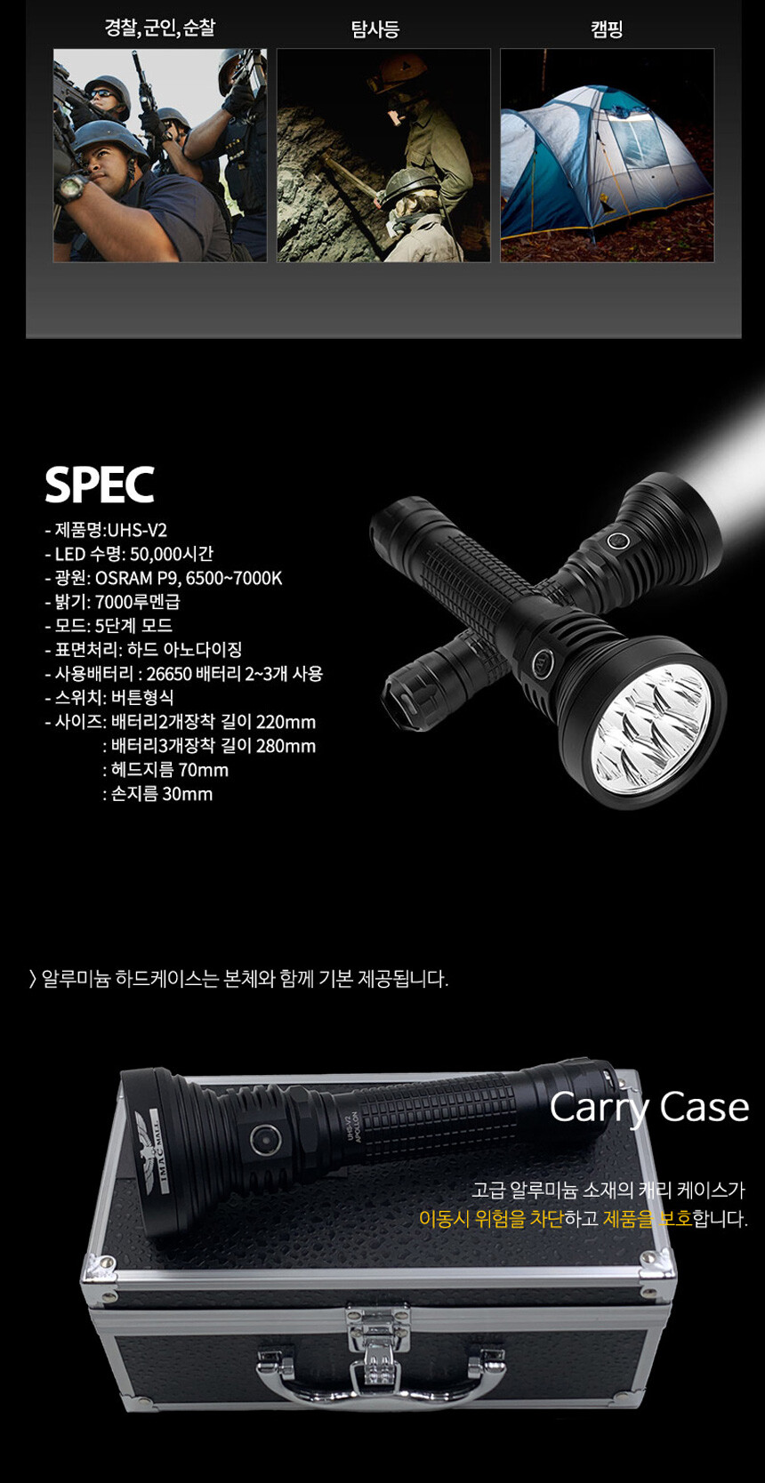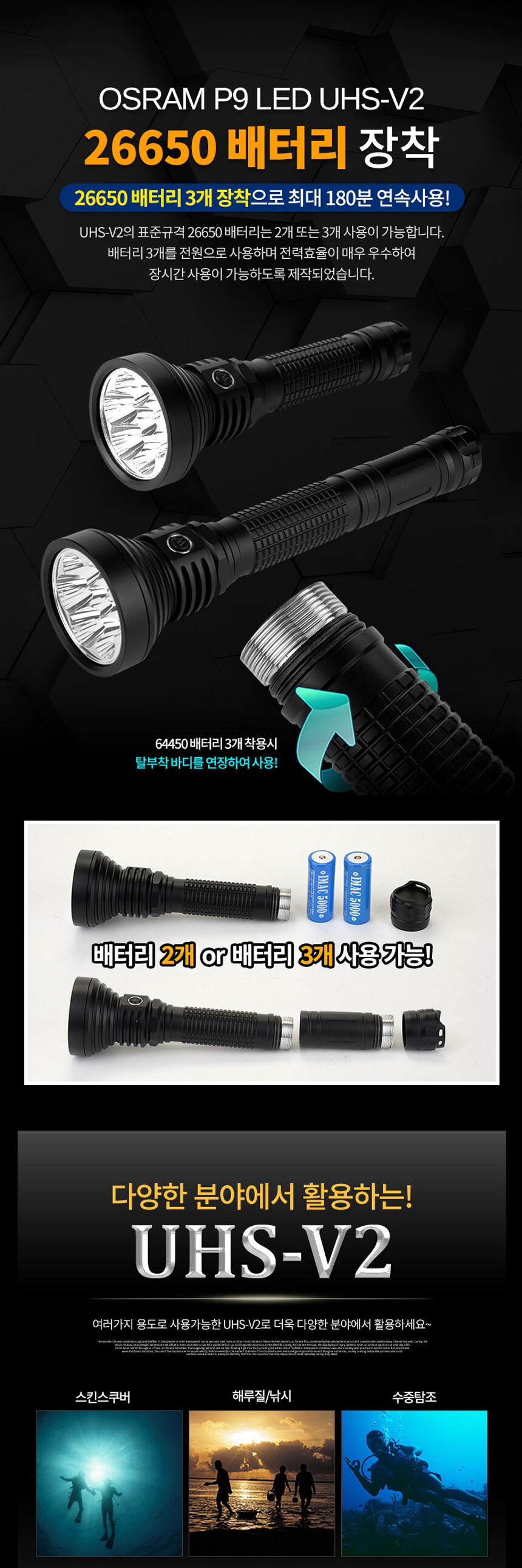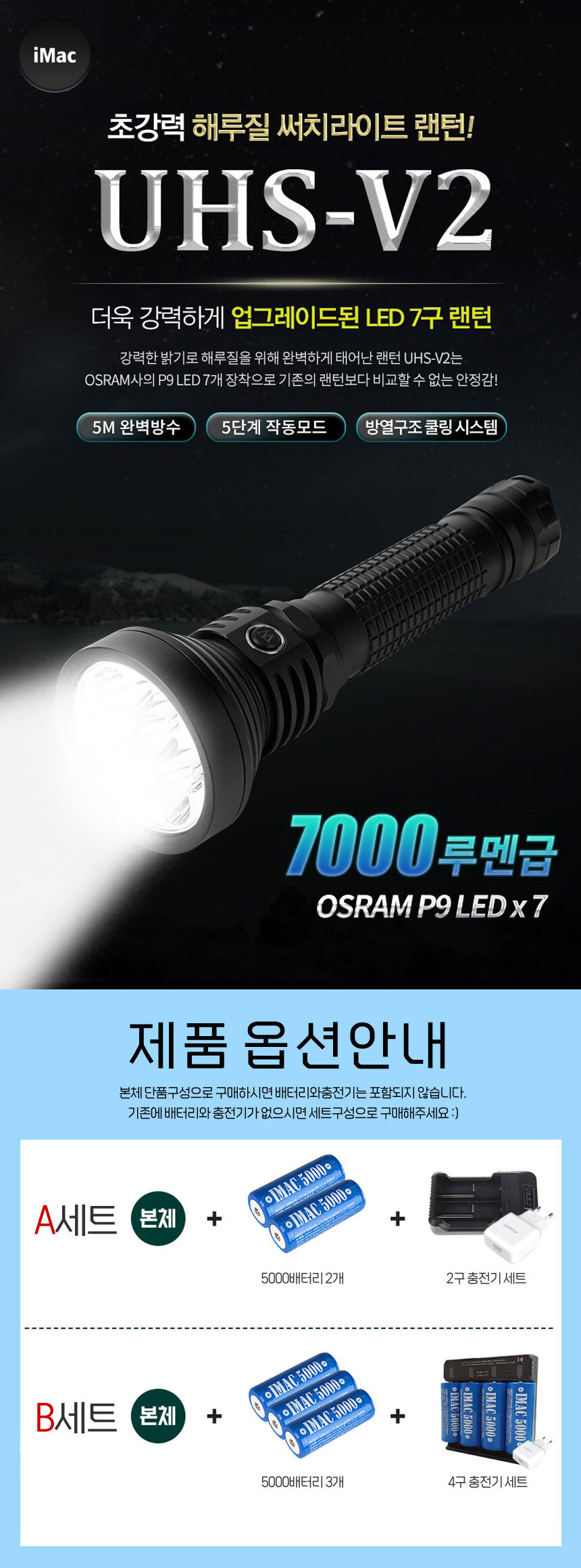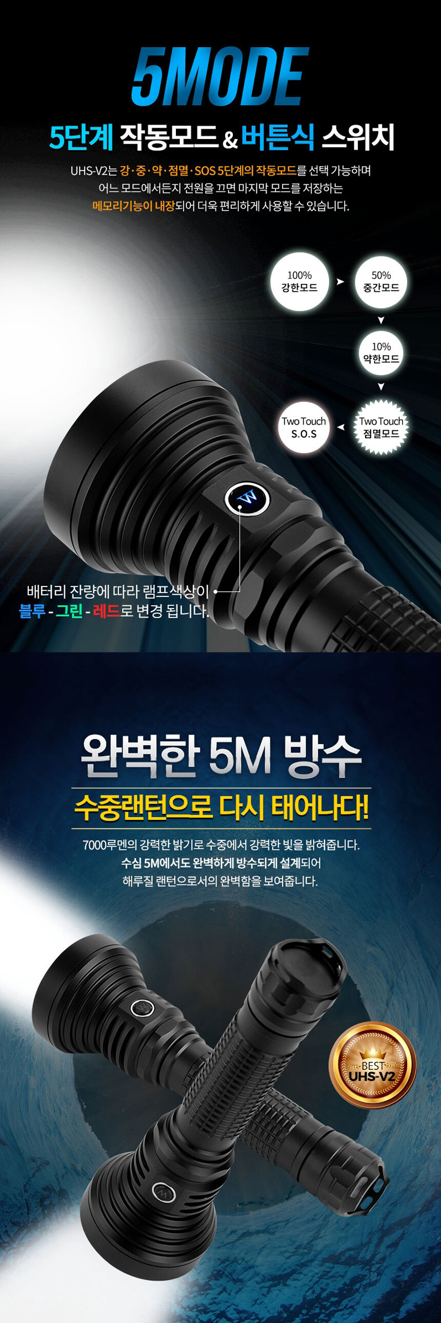 * UHS-V2는 7000루멘의 강력한 밝기출력과 5M 완벽 방수가 가능한 제품입니다.